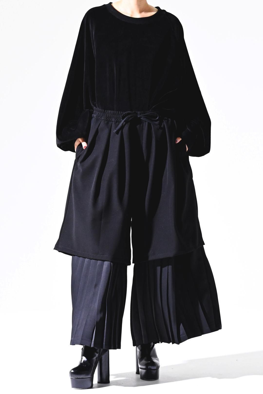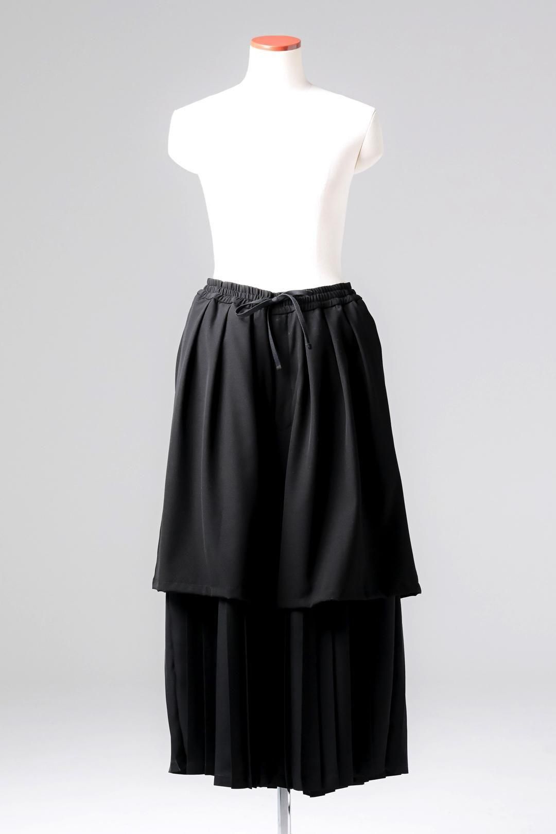 プリーツパンツの上からウールシルク生地のパンツを重ねた様な、