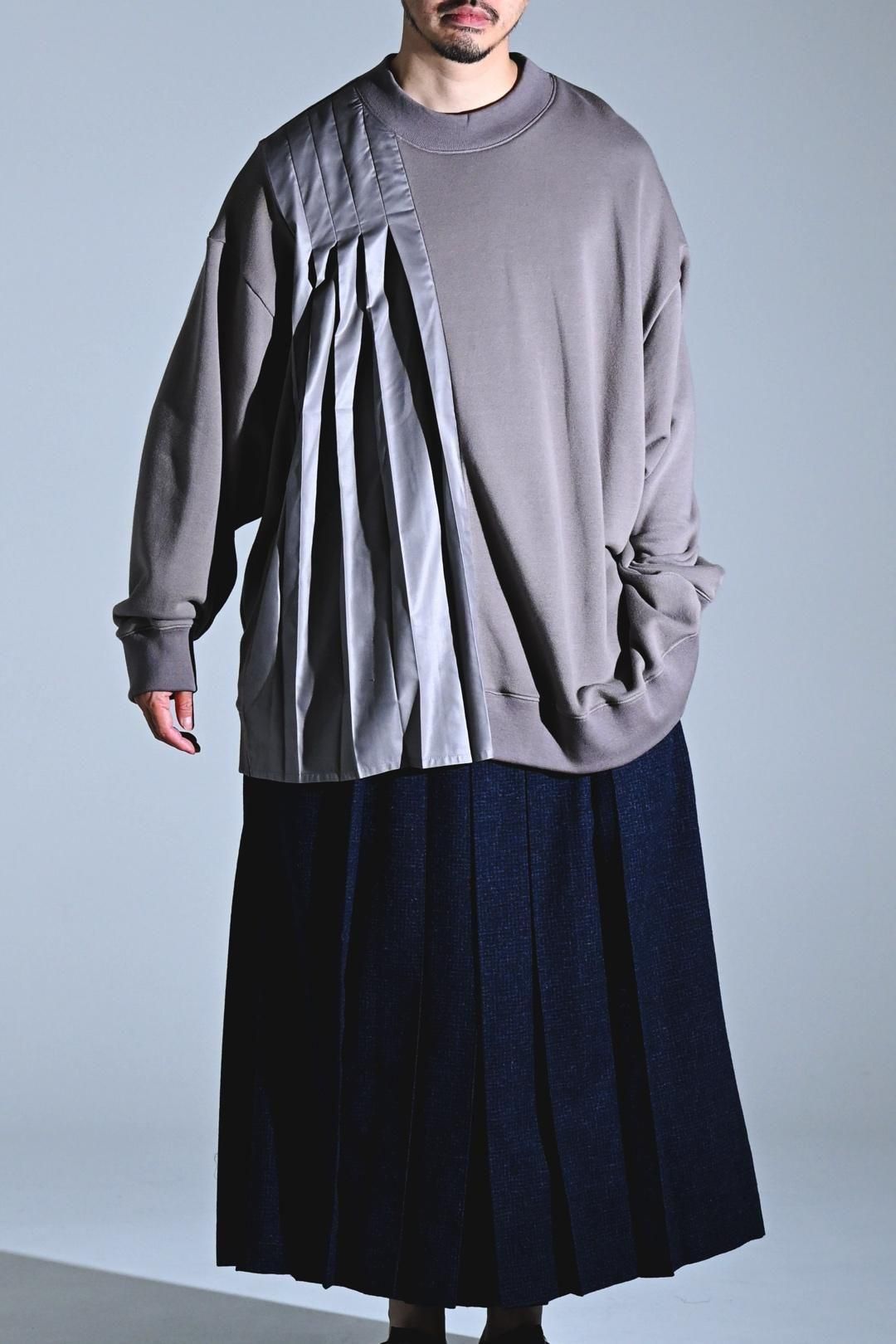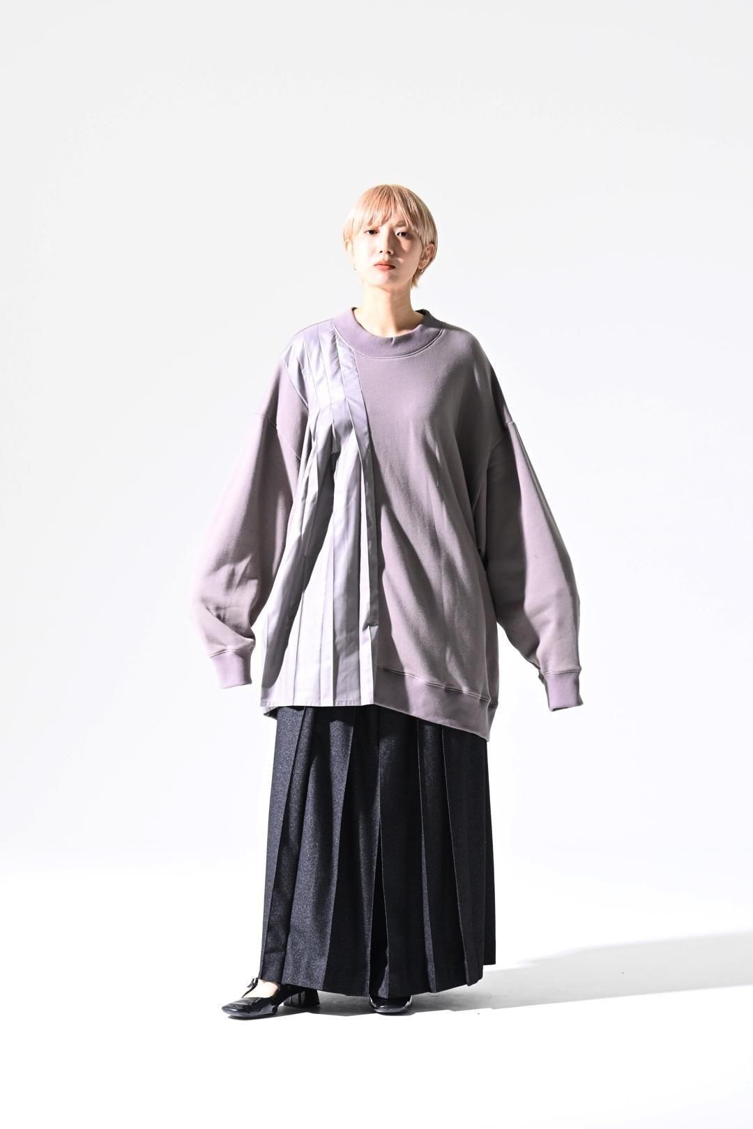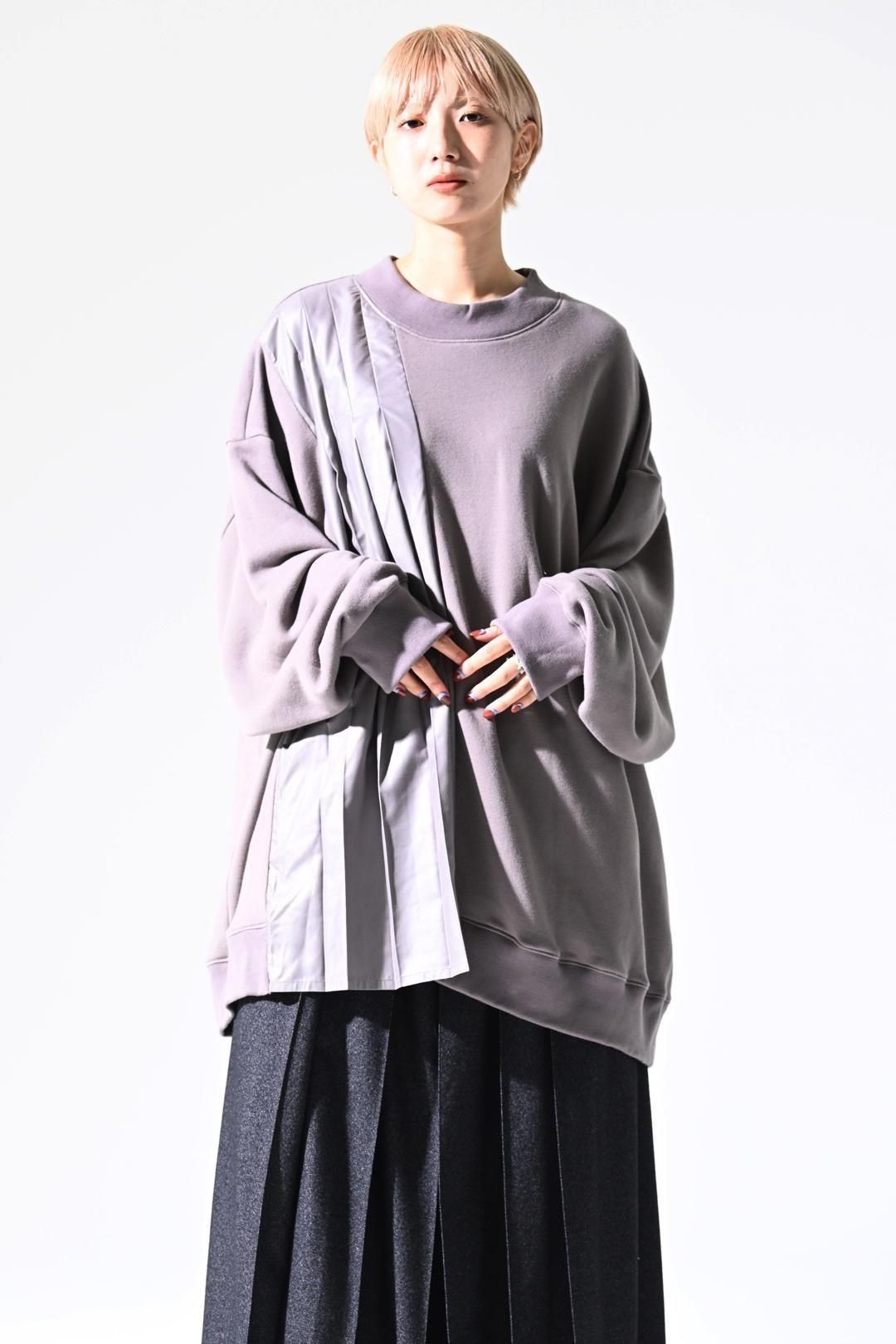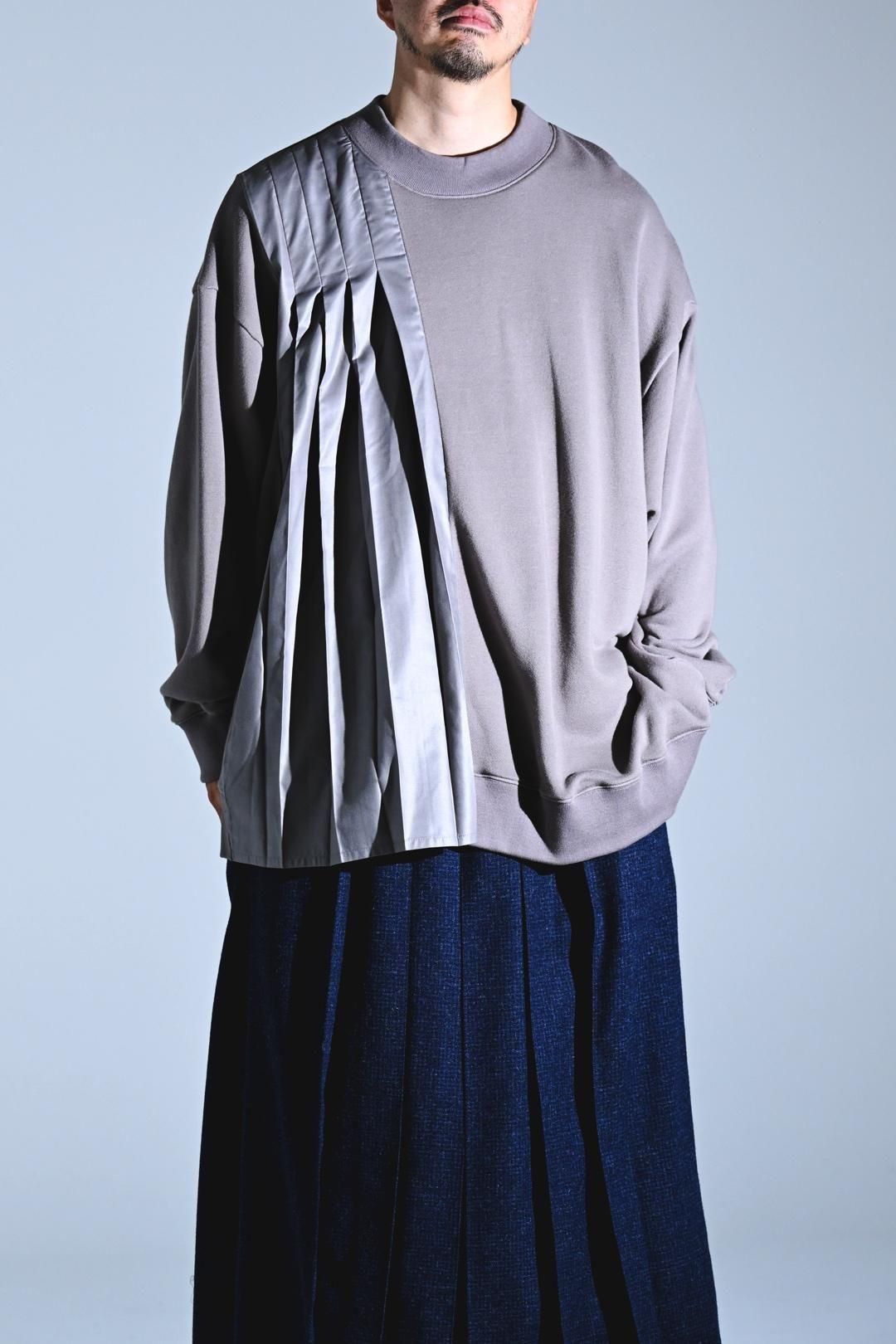 オーバーサイズのスウェットにプリーツ生地を大胆に挟み込んだ独創的な1着。