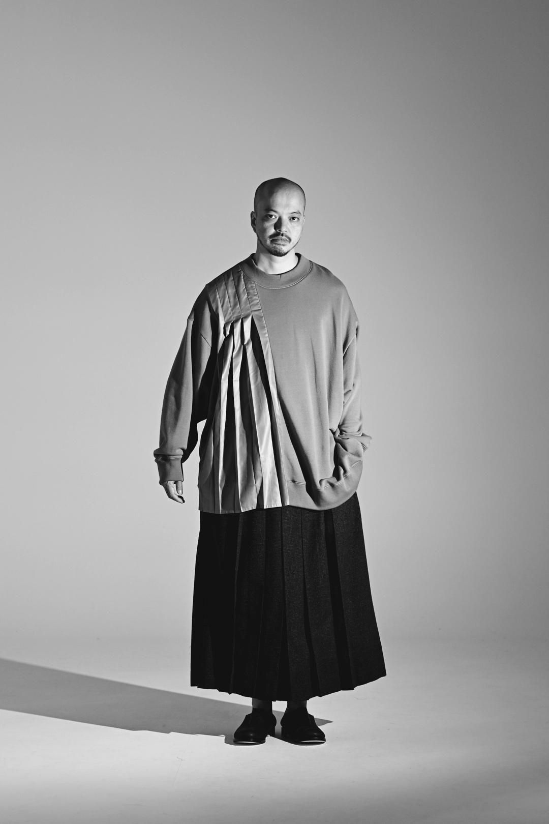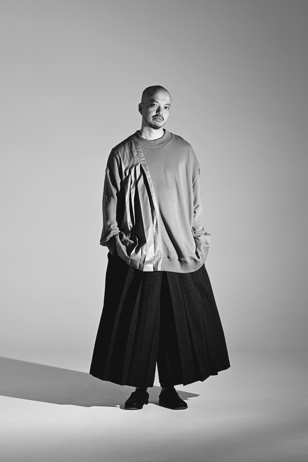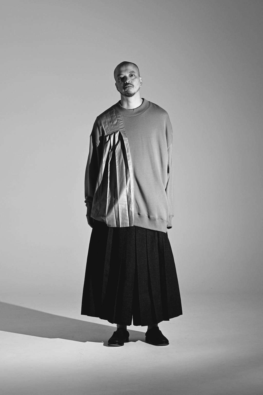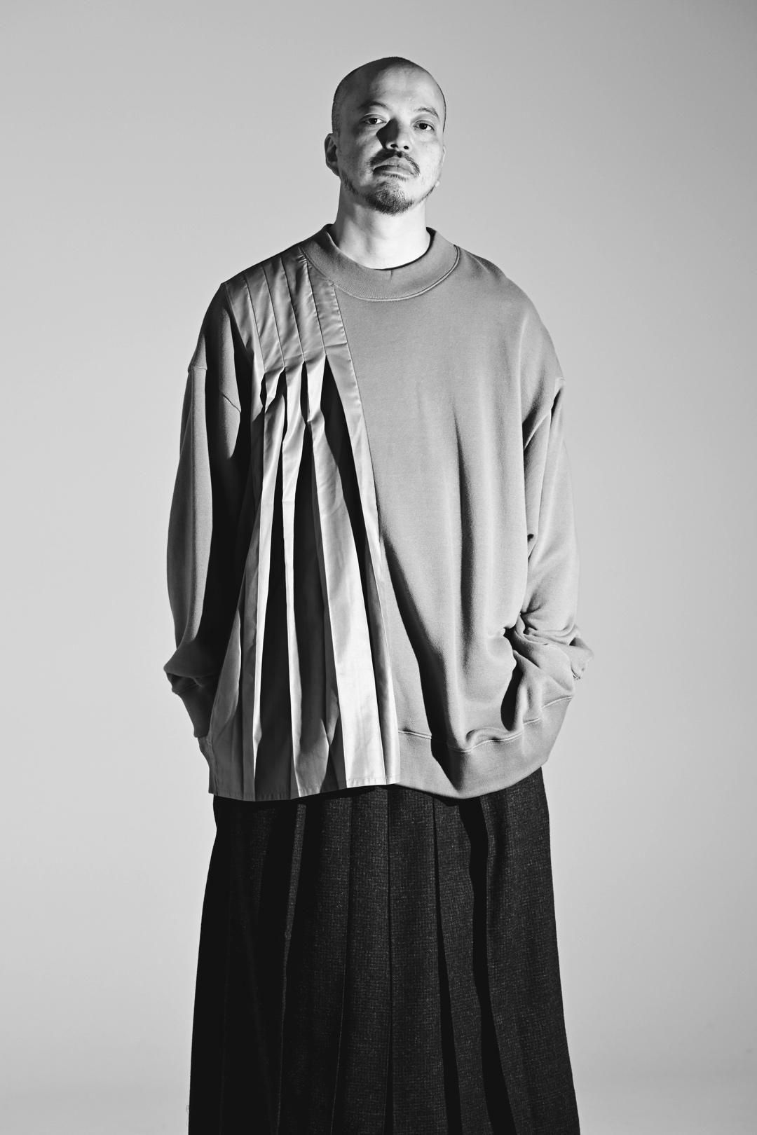 オーバーサイズのスウェットにプリーツ生地を大胆に挟み込んだ独創的な1着。